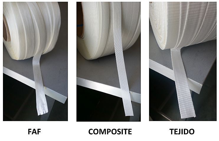 Para distinguir los diferentes tipos de fleje textil, hay que saber que lo que se suele llamar FAF son hilos de poliéster longitudinalmente a lo largo del fleje, y para que no se deshilachen, llevan un adhesivo llamado Hot-Melt, que se coloca caliente durante la fabricación del fleje.
