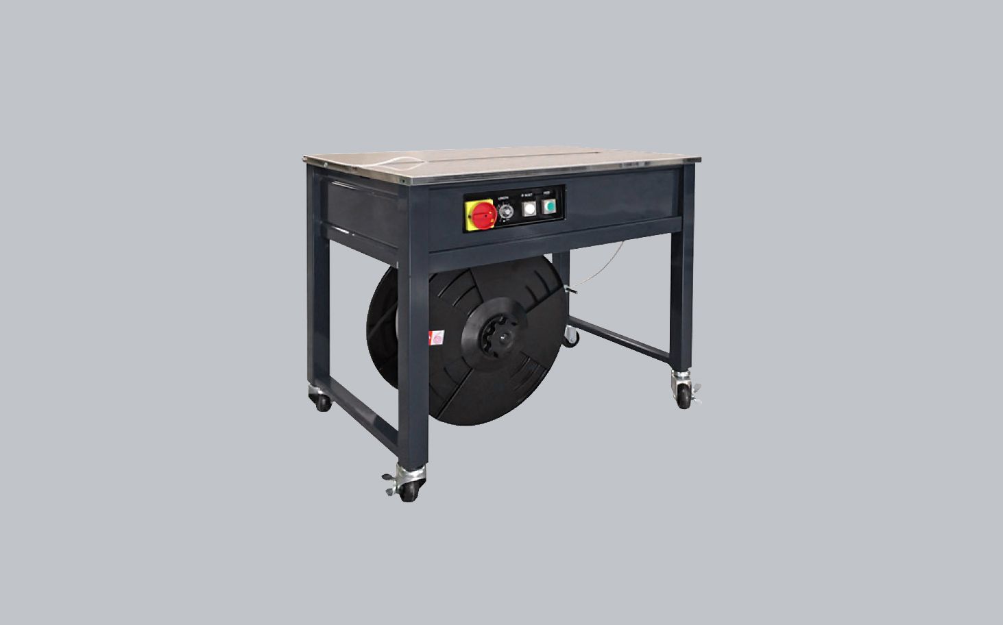 Máquina flejadora automática de mesa con excelente rendimiento con fleje de 12 mm. El mejor rendimiento en su categoría.